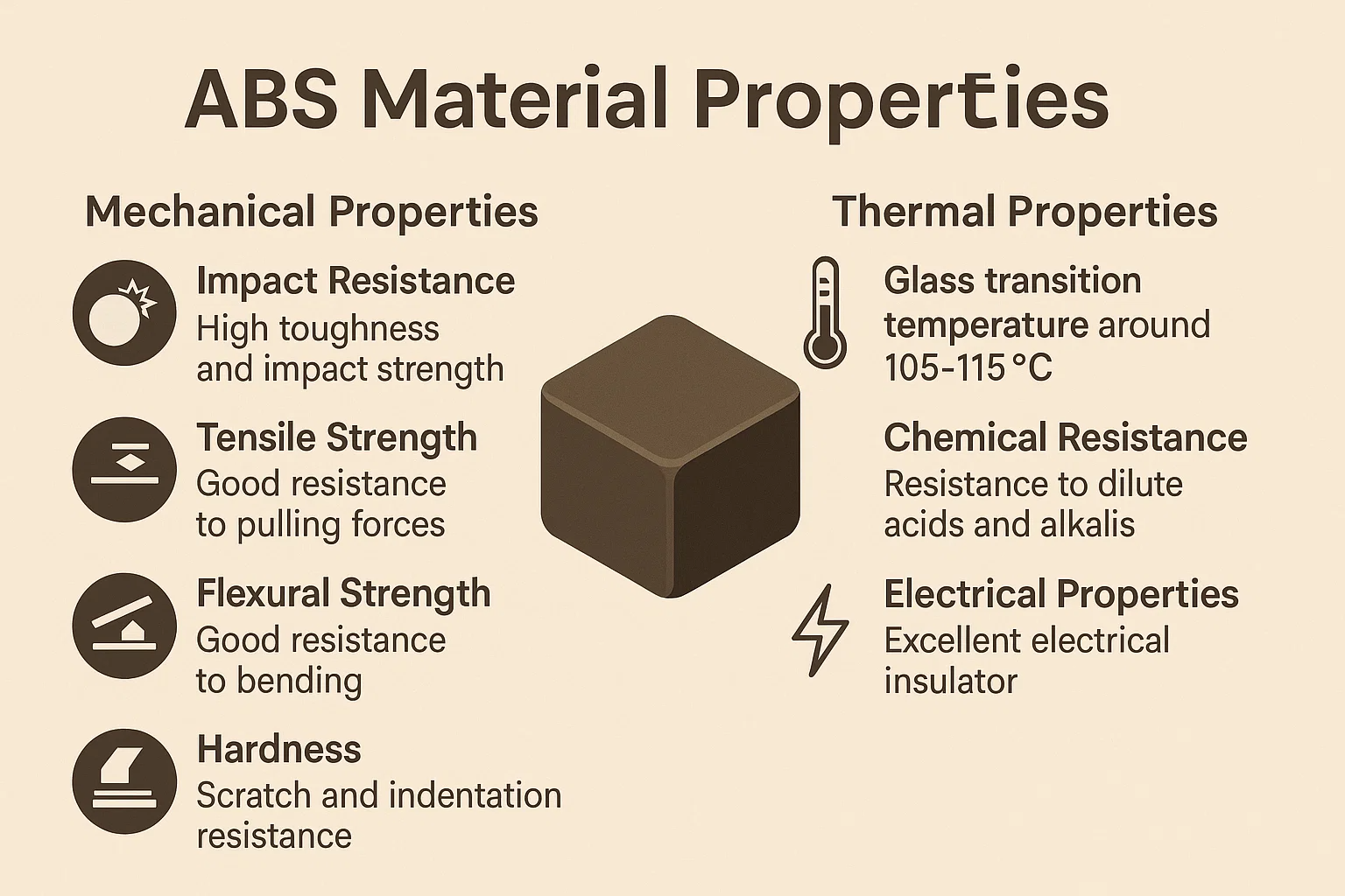 Die einzigartige Kombination und Veredelung dieser drei Monomere führt zu einem Material, das die Stärken der einzelnen Nutzungen nutzt und einen robusten Kunststoff mit einem bemerkenswerten Gleichgewicht der Eigenschaften erzeugt. Im Gegensatz zu kristallinen oder halbkristallinen Polymeren hat ABS eine amorphe Struktur, die ihm eine gute dimensionale Stabilität und ein breites Verarbeitungsfenster verleiht.