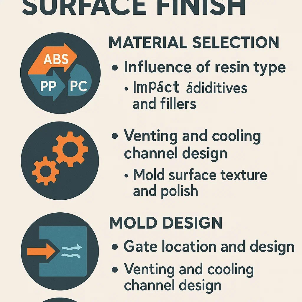 - Werkzeugpräzision: Die mold dictates the maximum achievable finish. Investing in appropriate Formenpolieren (zu einem bestimmten R a Wert bzw SPI-Klasse ) oder hochpräzise Anwendung Oberflächenstrukturierung (chemisch oder Laser) ist unerlässlich. Richtig entlüften und uniform Kühlkanaldesign sind zur Vermeidung von Mängeln nicht verhandelbar.