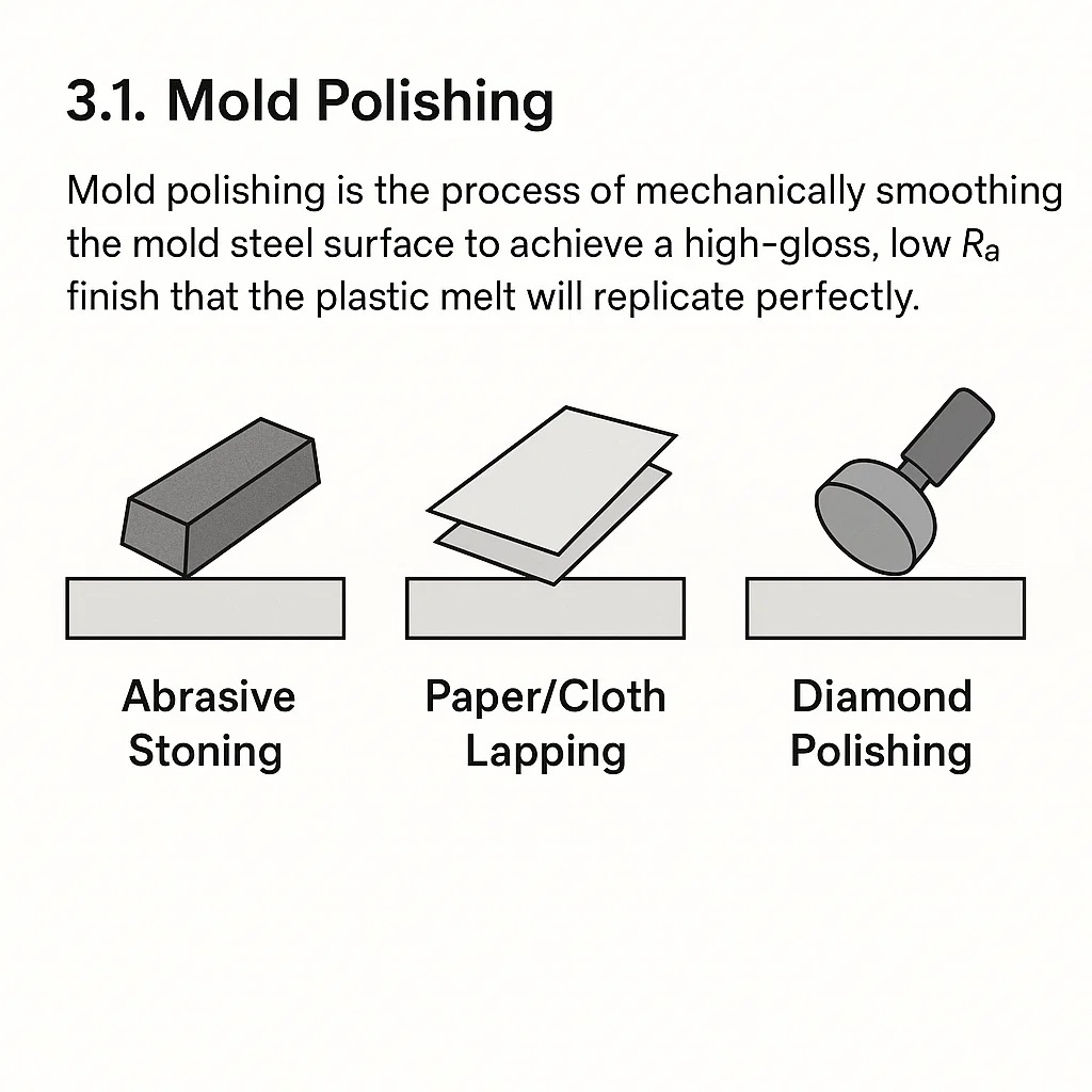 - Formenpolieren: Für hochglanzpolierte Teile (SPI A-Qualitäten) ist eine Präzisionspolitur mit Diamantpaste oder Schleifsteinen erforderlich.