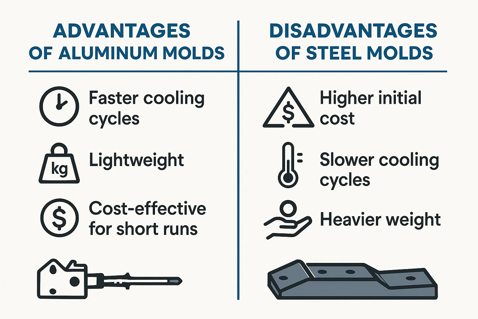 Langsamere Kühlzyklen: Die niedrigere thermische Leitfähigkeit des Stahls bedeutet, dass er länger Wärme behält. Dies erweitert die Kühlzeit für jeden Teil und führt dazu Langsamere Produktionszyklen und reduzierter Ausgang im Vergleich zu einer Aluminiumform.