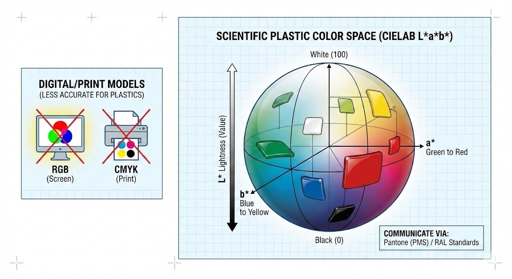 Bevor man in die Maschinerie eintaucht, ist es wichtig zu verstehen, wie Farbe in einem physischen, dreidimensionalen Mittel wie Kunststoff funktioniert. Viele Designfehler treten auf, weil Stakeholder auf digitale Farbmodelle angewiesen sind, die sich nicht gut auf die physische Fertigung übertragen lassen.