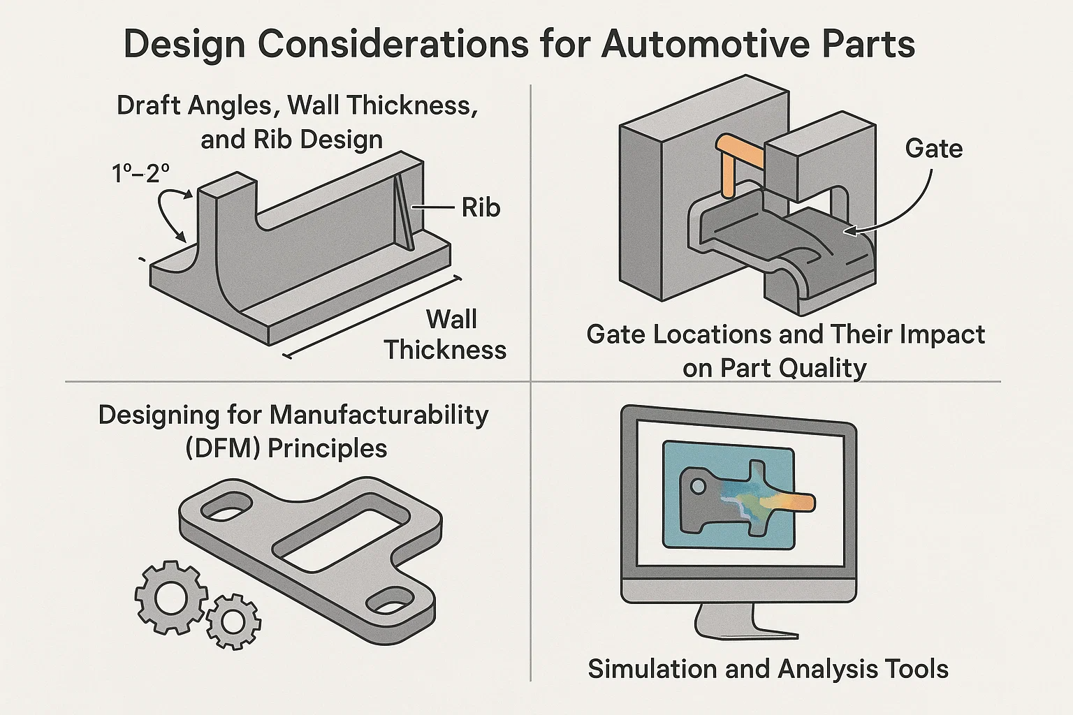 Der Erfolg von inspritzgeformten und überlasteten Automobilteilen hängt von einem akribischen Entwurfsprozess ab. Ein gut gestalteter Teil ist nicht nur funktional, sondern auch hergestellt, langlebig und kostengünstig. Die Einhaltung grundlegender Entwurfsprinzipien ist entscheidend, um gemeinsame Probleme wie Verzerrungen, schwache Bindungen und kosmetische Defekte zu vermeiden.