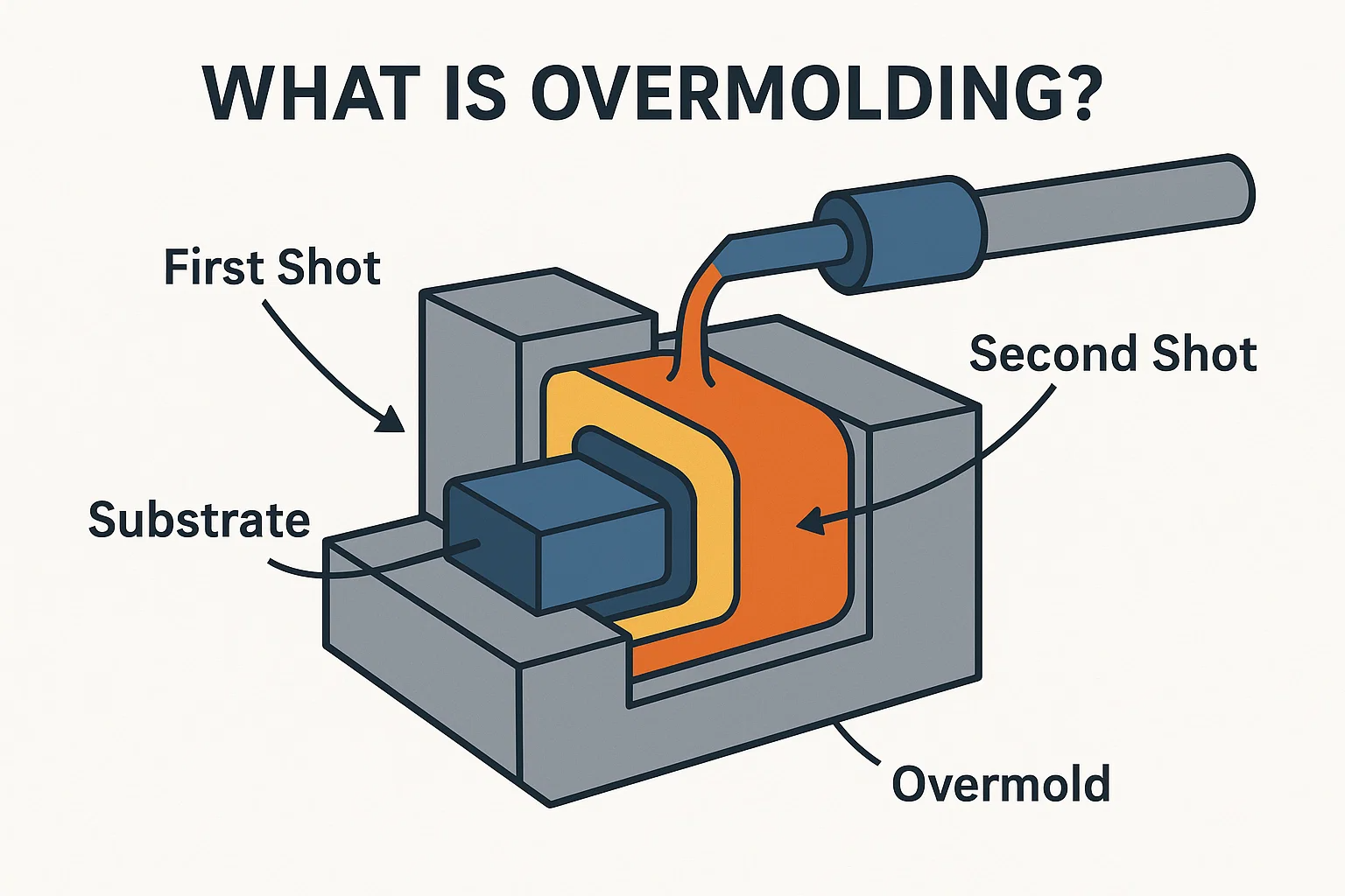 Overmolding ist ein spezielles Injektionsformprozess, das das Konzept von Multi-Materials-Teilen weiter weiter führt. Es beinhaltet das Formen eines Materials-typischerweise einen weichen, flexiblen Thermoplastik-über einen bereits bestehenden Teil oder ein Substrat, das normalerweise ein starres Kunststoff oder ein Metall ist. Dies erzeugt eine einzelne, integrierte Komponente mit den kombinierten Eigenschaften beider Materialien.