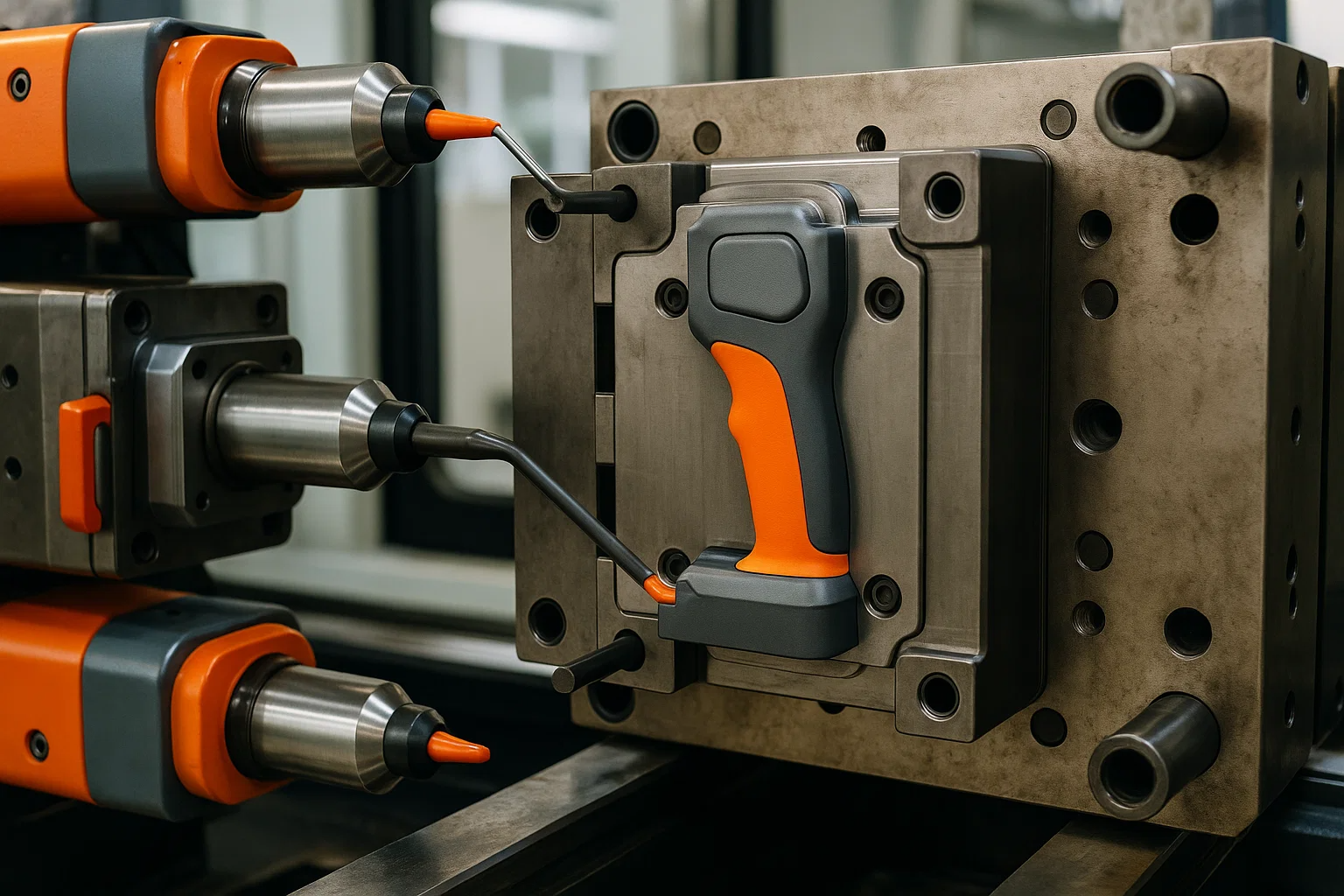 Overmolding & Co-Molding: Kann manuelles Kleben von Griffen, die Montage von Robben oder Malerei für mehrfarbige Teile beseitigen.