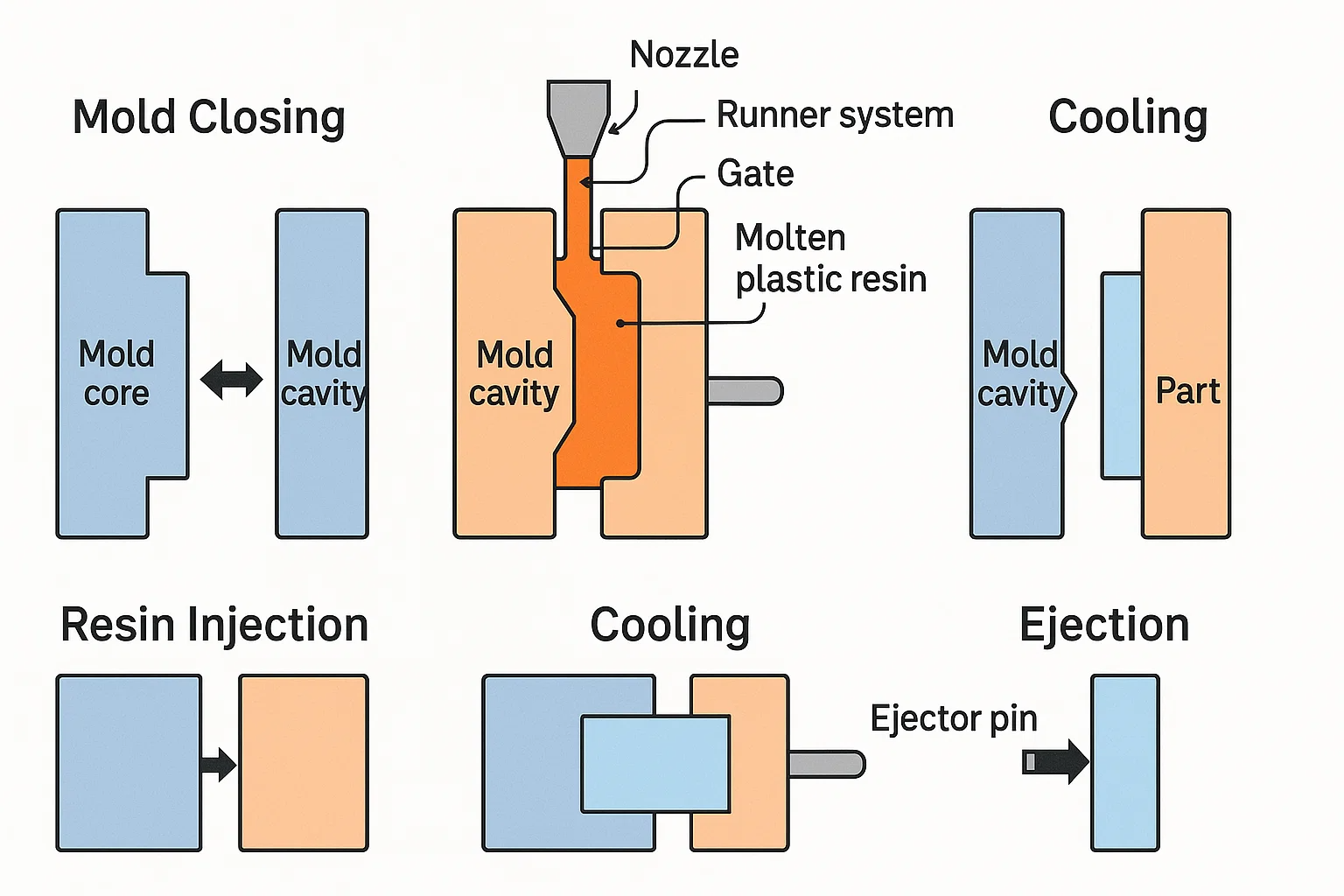 Harzinjektion: Geschmolzenes Kunststoffharz wird unter hohem Druck durch eine Düse und in die Form injiziert. Das Material reist durch die Runner -System and Tor - die Teil der Höhle der Höhle sind - und füllt den Raum zwischen Kern und Hohlraum. Der Kern verdrängt das Harz, um die innere Form des Teils zu bilden, während der Hohlraum die Außenhülle bildet.