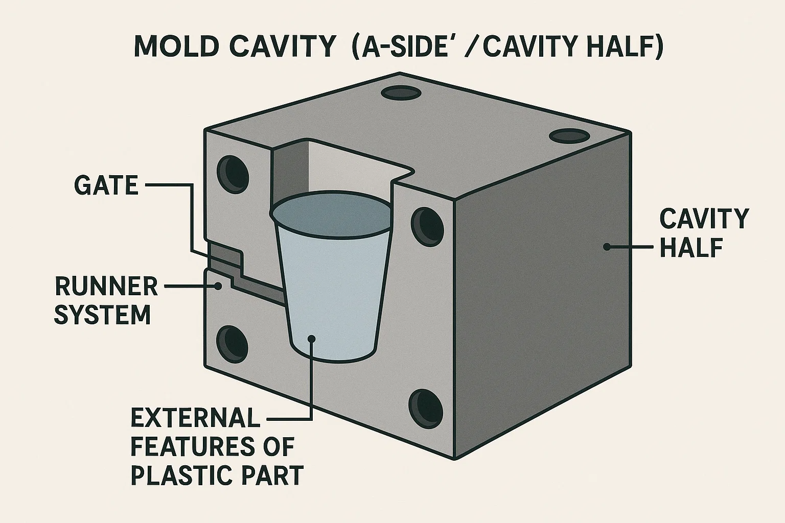 Der Schimmelpilzhöhle , auch bekannt als "A-Seite" oder "Hohlraumhälfte", ist die Komponente, die die bildet externe Merkmale des plastischen Teils. Es ist die äußere Hülle oder Behälter, die der geschmolzene Kunststoff füllt. Mit der Plastikbecher -Analogie würde der Hohlraum die Außenseite der Tasse bilden, einschließlich der Lippen- und der Außenwände.