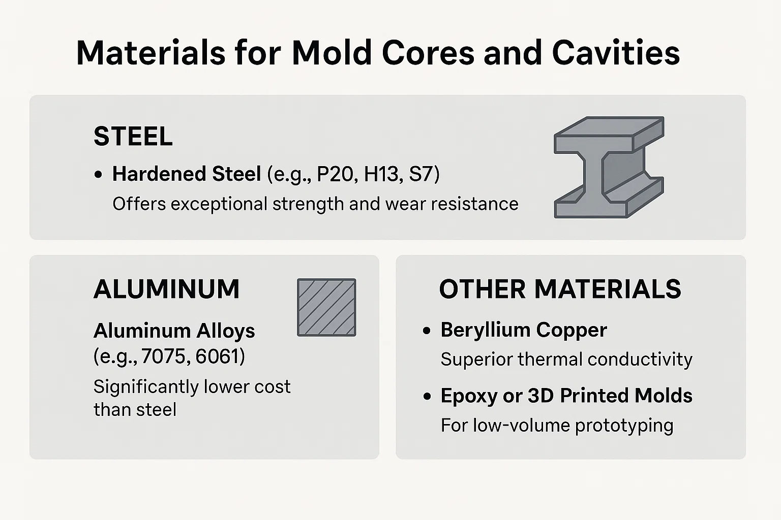 Das für den Formkern und den Hohlraum ausgewählte Material ist kritisch, da es direkt die Haltbarkeit, Kosten und die Fähigkeit der Form, qualitativ hochwertige Teile effizient zu erzeugen, direkt beeinflusst. Die Auswahl hängt von Faktoren wie der Art des geformten Kunststoffs, dem erforderlichen Produktionsvolumen und der Komplexität des Teildesigns ab.
