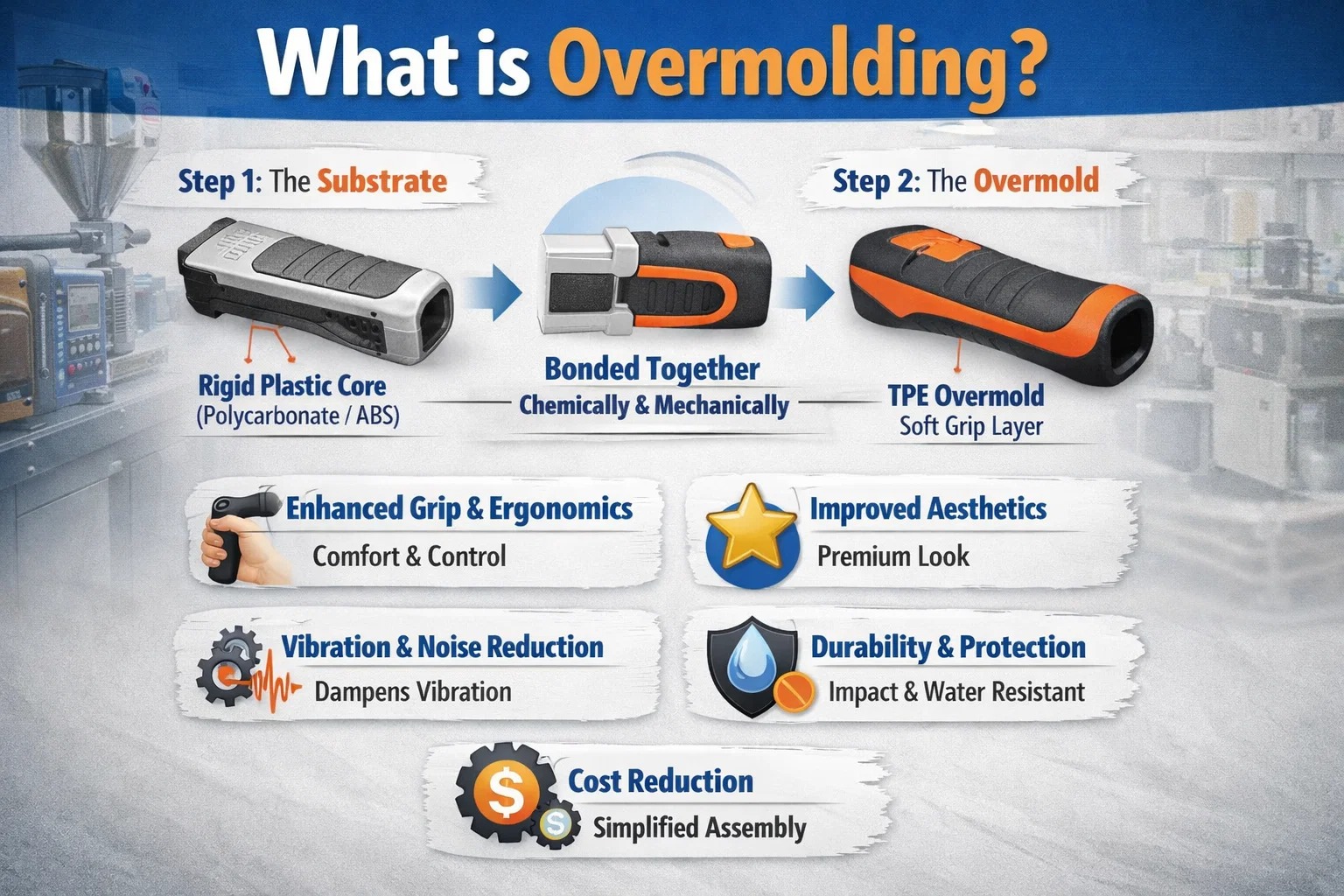 Beim Überformen geht es aber nicht nur darum, den Dingen ein angenehmes Gefühl zu verleihen. Für Ingenieure und B2B-Einkäufer stellt es eine strategische Fertigungsentscheidung dar, die Montagelinien vereinfachen, Feuchtigkeit abdichten und Vibrationen absorbieren kann – oft bei gleichzeitiger Senkung der Gesamtproduktionskosten.
