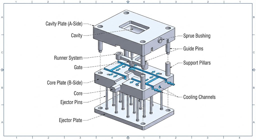 - Der Hohlraum und der Kern: Die primären „A“- und „B“-Seiten, die die Form des Kunststoffteils bilden.