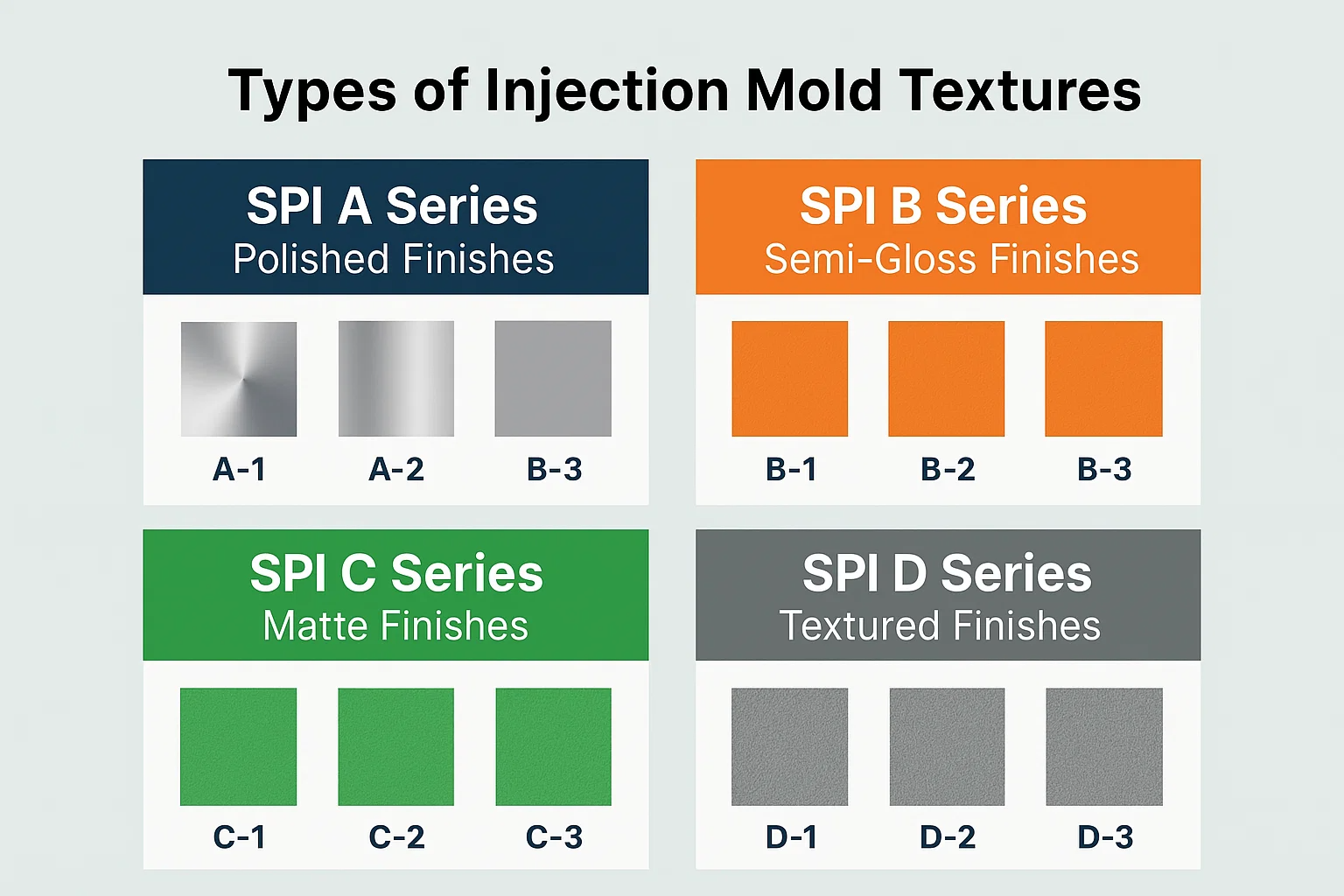 Die Welt der Injektionsformtexturen ist groß, ist jedoch weitgehend durch ein System, das von der Gesellschaft der Kunststoffindustrie (SPI) entwickelt wurde, weitgehend standardisiert. Das Verständnis dieser Standards ist entscheidend, um das genaue Finish für einen Teil anzugeben.