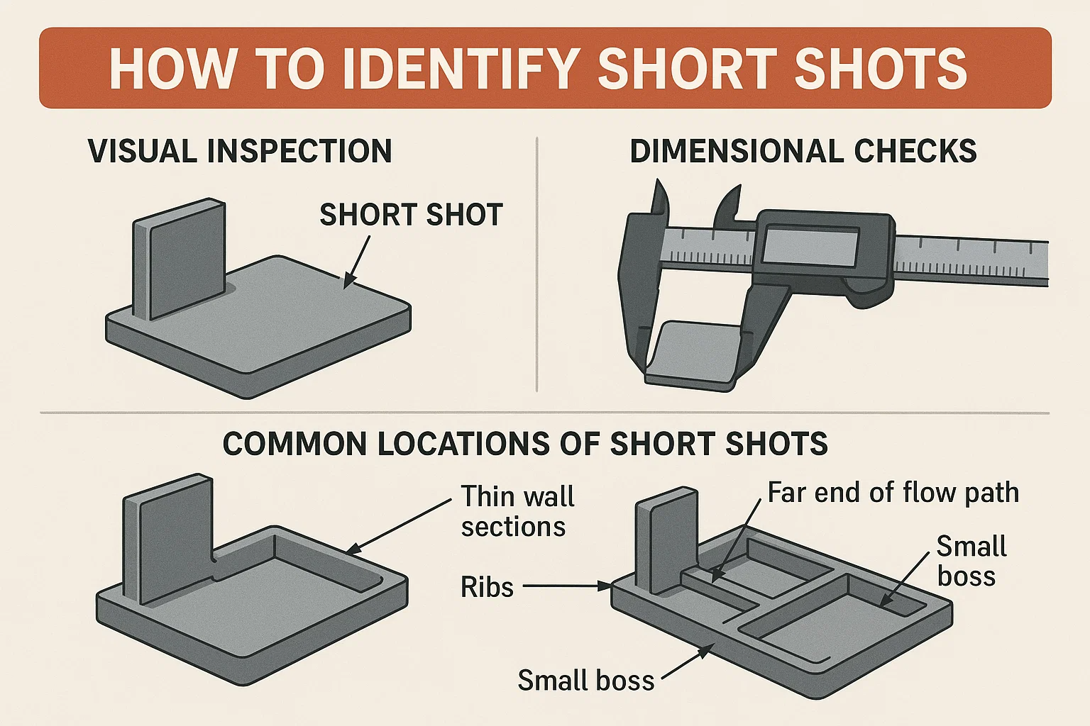 Kurzaufnahmen treten fast immer am Ende des Fließweges , was ist der Punkt am weitesten vom Tor, an dem der Plastik in den Hohlraum eindringt. Der geschmolzene Plastik verliert auf dem Weg von Wärme und Druck, sodass die letzten Bereiche am anfälligsten für einen kurzen Schuss sind. Diese Bereiche sind oft: