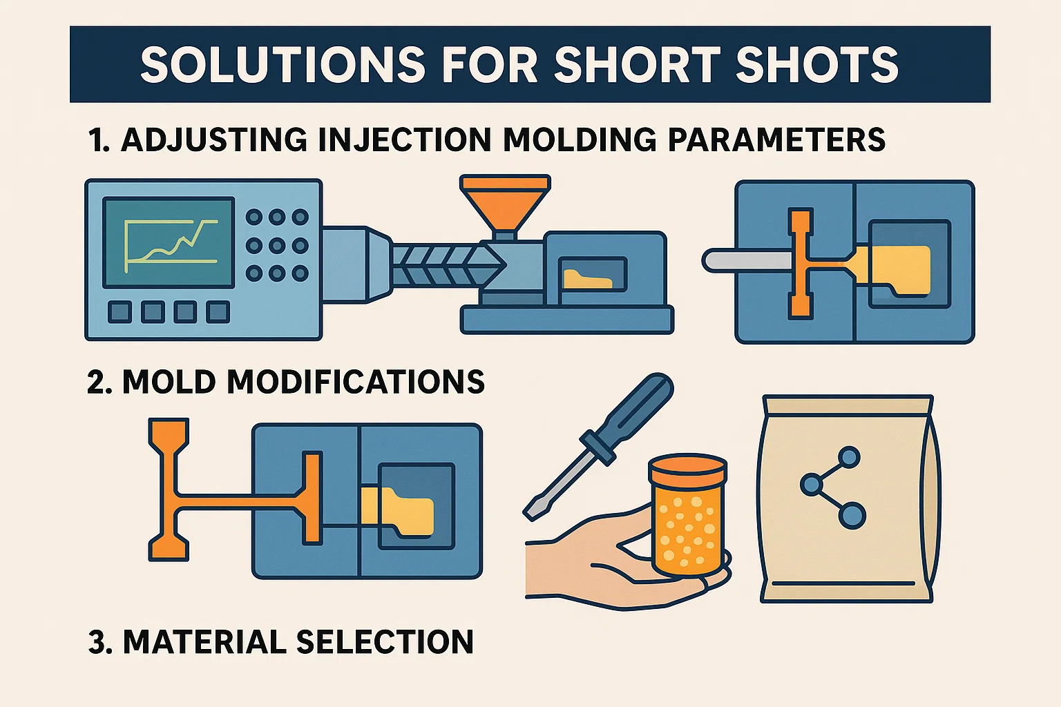 Die Lösung eines kurzen Schusses erfordert einen strategischen Ansatz. Es ist oft am besten, mit den einfachsten und kostengünstigsten Lösungen zu beginnen, bevor sie zu komplexeren und teureren wechseln. Beginnen Sie mit Maschineneinstellungen, betrachten Sie dann Material und schauen Sie sich schließlich die Form selbst an.
